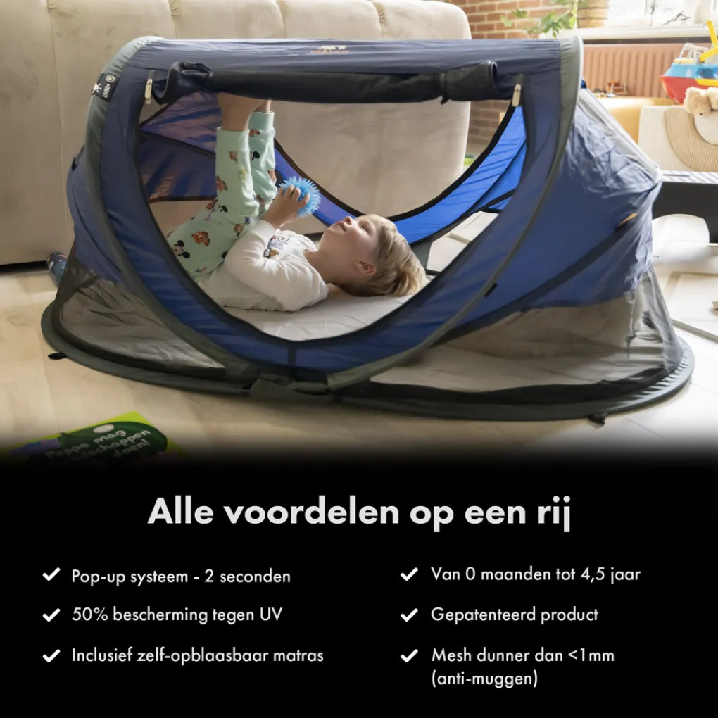 De DERYAN Peuter Luxe is dé ideale oplossing én vervanging van het zware campingbedje. Laat je niets meer in de weg staan met deze compacte, lichtgewicht & pop-up reistent. De DERYAN Peuter Luxe biedt ultieme bescherming tegen zon, muggen en andere insecten. Met zijn 2,4 kg neem je ‘m in een handomdraai mee naar ouders, familie, vrienden, vakantie of zelfs de wereldreis van je dromen!