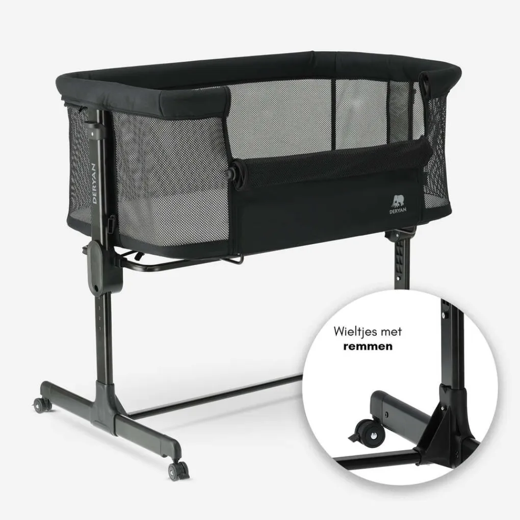 Deze co-sleeper is perfect voor de eerste maanden van je kindje. Met dit bedje zorg je ervoor dat je kleintje wel een eigen plekje heeft, maar toch dichtbij is.Voordelen:✓ Makkelijk verplaatsbaar door wieltjes met remmen✓ Geschikt vanaf de geboorte tot ongeveer 6 maanden✓ Te verstellen in 7 verschillende hoogtes✓ Inclusief matrasjeStevig en verrijdbaarDeze co-sleeper heeft een stevig frame en heeft een luxe look. Daarnaast is het frame voorzien van wieltjes, waardoor je het bedje makkelijk kunt verplaatsen. Alle 4 de wielen zijn tevens voorzien van een rem.Anti-refluxDoor de zijde waar je kindje met het hoofdje ligt hoger te zetten dan de voetjes, wordt de kans op reflux verminderd. Dit kan helpen om buikkrampjes bij je kindje te voorkomen.Verstelbare wiegDe co-sleeper heeft 7 standen, waardoor er altijd een mogelijkheid is om deze aan te sluiten op het ouderlijk bed. Door de bijgeleverde banden zorg je ervoor dat de co-sleeper stevig aan het bed vast zit.Veelzijdig gebruikDe co-sleeper kan dus gebruikt worden als verlengstuk voor het ouderlijk bed, maar ook als losstaand wiegje. Een zijde kan namelijk zowel los als vast geritst worden. Zo kan je kindje dan ook in zijn of haar eigen wiegje slapen.Afmetingen: 87×50 cmMaximale matrashoogte: 73 cm