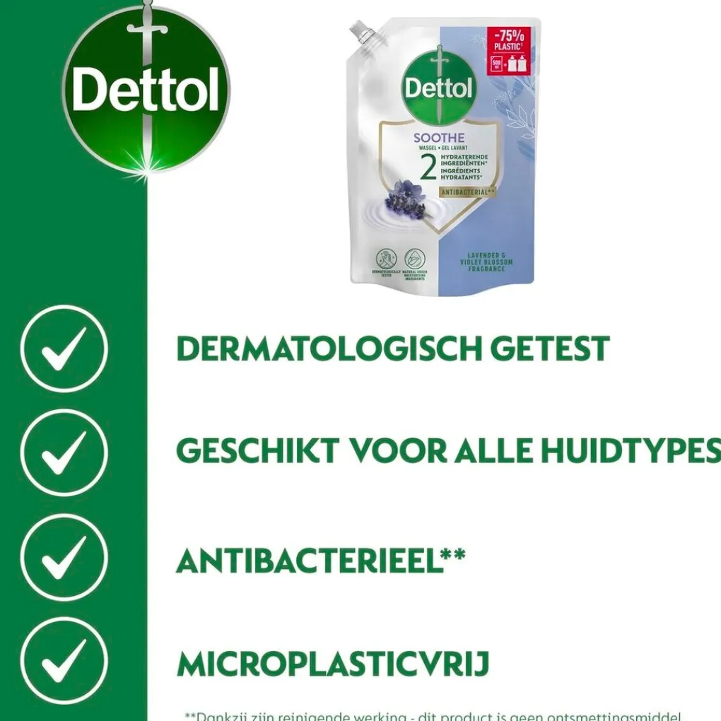 Dettol Relaxing Lavendel Anti-bacteriële Wasgel Navulling is zacht voor je huid en hard voor het vuil. De wasgel is antibacterieel* dankzij de reinigende werking, maar het is geen ontsmettingsmiddel.