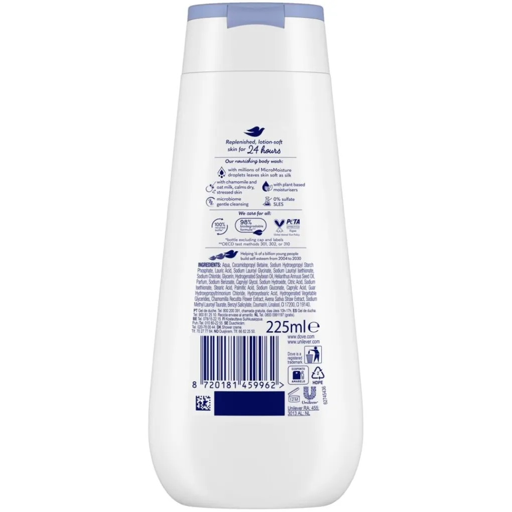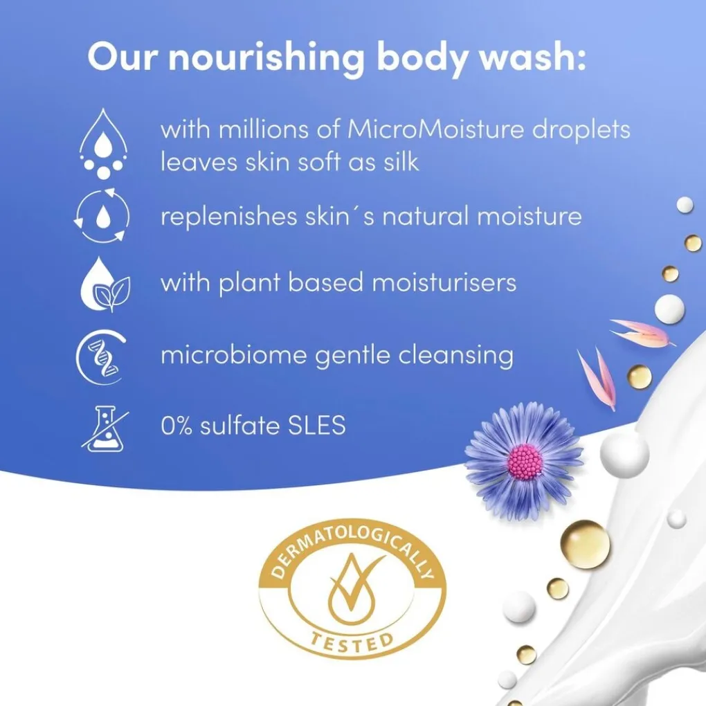 De douchecrème biedt de verzorging die je droge huid nodig heeft, met 93% zichtbare huidverbetering na slechts één douchebeurt. De hydraterende formule is verrijkt met 24 uur vernieuwende micro moisture. De snel afspoelbare, vochtinbrengende douchecrème geeft je een heerlijk schuim en een ontspannen, fris gevoel, terwijl hij de droge huid kalmeert en hydrateert.
