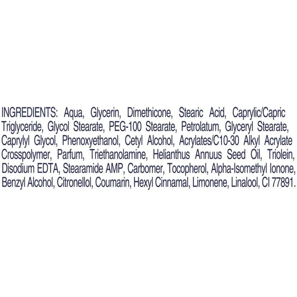 Ingredients: Aqua, Glycerin, Dimethicone, Stearic Acid, Caprylic/Capric Triglyceride, Glycol Stearate, PEG-100 Stearate, Petrolatum, Glyceryl Stearate, Caprylyl Glycol, Panthenol, Phenoxyethanol, Cetyl Alcohol, Parfum, Acrylates/C10-30 Alkyl Acrylate Crosspolymer, Triethanolamine, Helianthus Annuus Seed Oil, Triolein, Disodium EDTA, Stearamide AMP, Carbomer, Tocopherol, Alpha-Isomethyl Ionone, Benzyl Alcohol, Citronellol, Coumarin, Geraniol, Hexyl Cinnamal, Limonene, Linalool.