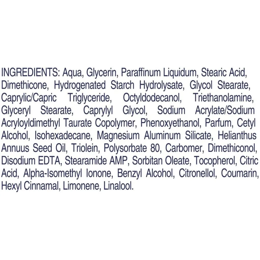 Ingredients: Aqua, Glycerin, Paraffinum Liquidum, Stearic Acid, Dimethicone, Hydrogenated Starch Hydrolysate, Glycol Stearate, Caprylic/Capric Triglyceride, Octyldodecanol, Triethanolamine, Glyceryl Stearate, Caprylyl Glycol, Sodium Acrylate/Sodium Acryloyldimethyl Taurate Copolymer, Phenoxyethanol, Parfum, Cetyl Alcohol, Isohexadecane, Magnesium Aluminum Silicate, Helianthus Annuus Seed Oil, Triolein, Polysorbate 80, Carbomer, Dimethiconol, Disodium EDTA, Stearamide AMP, Sorbitan Oleate, Sodium Benzoate, Tocopherol, Alpha-Isomethyl Ionone, Benzyl Alcohol, Citronellol, Coumarin, Geraniol, Hexyl Cinnamal, Limonene, Linalool.