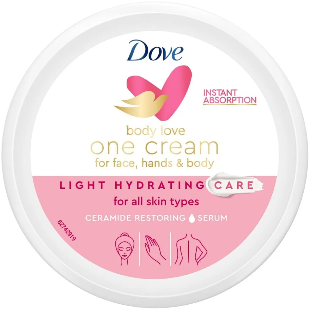 Dove Body Love Light Hydration One Cream is een lichte, verzorgende crème voor je handen, gezicht en lichaam. De crème heeft een niet vette formule en biedt 24 uur hydratatie voor een soepele, goed gehydrateerde en stralende huid.