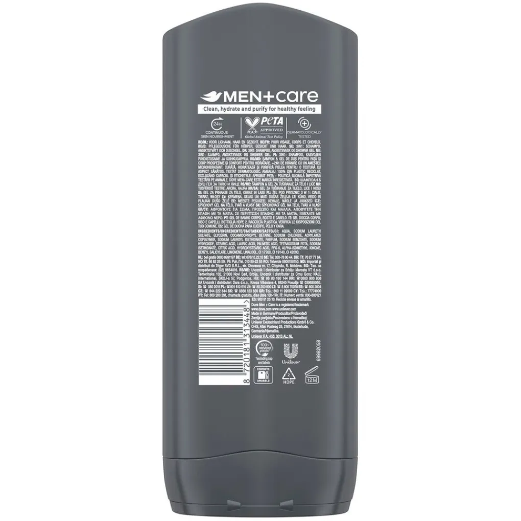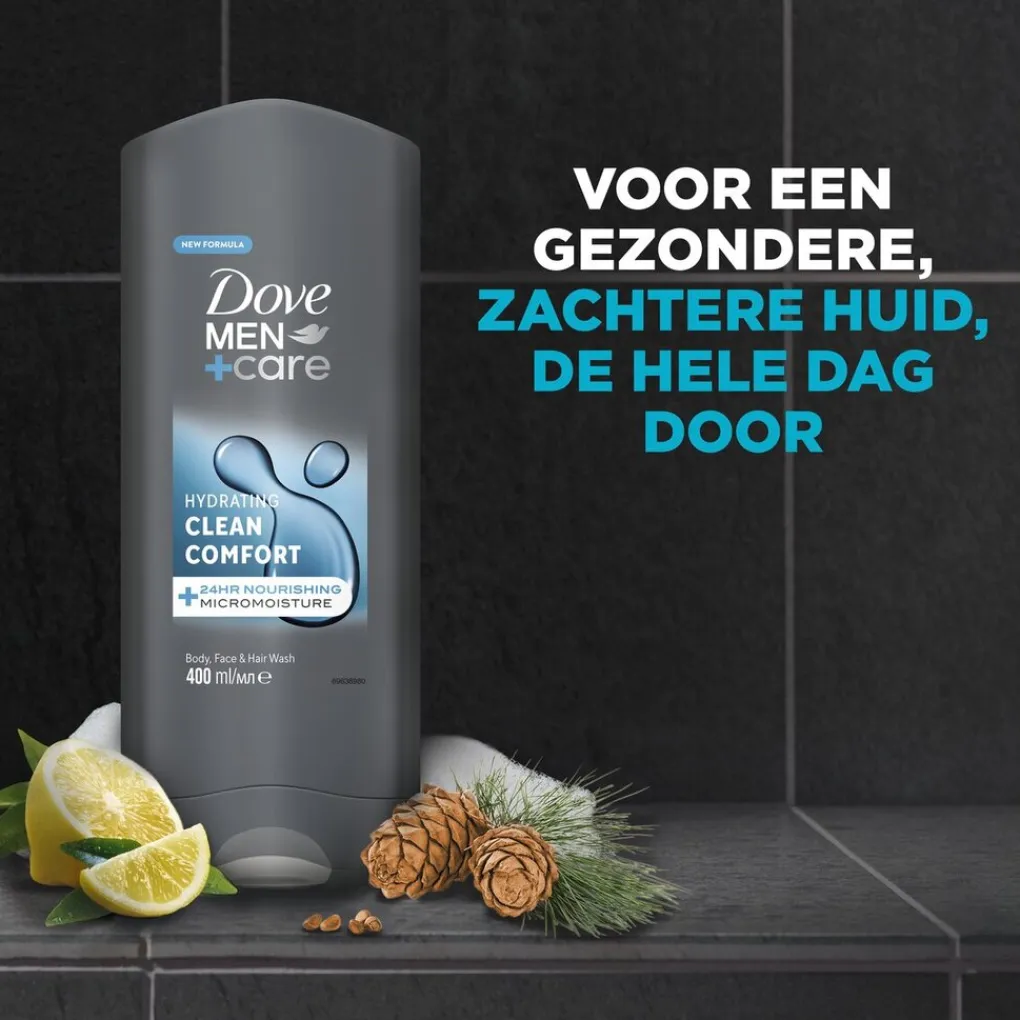 De Dove Men+Care Clean Comfort Douchegel heeft een unieke 24u MicroMoisture technologie en heeft vochtinbrengende bestanddelen op plantaardige basis die je huid hydrateren. Daarnaast bevat het drie huidversterkende voedingsstoffen die je huid voeden en sterker maken bij elke douchebeurt. Hierdoor begin je de dag goed met een huid die gezond, beter beschermd en sterk aanvoelt.