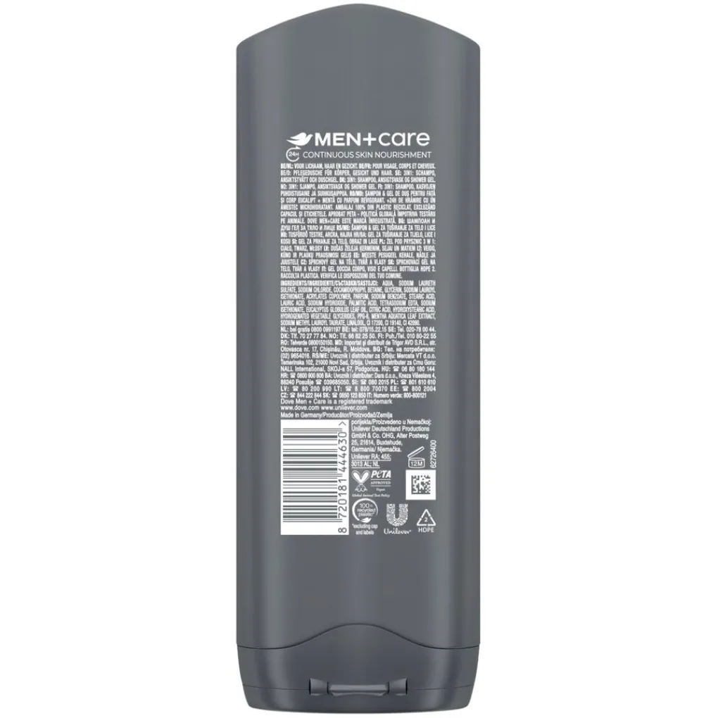 De Dove Men+Care Eucalyptus + Mint Douchegel heeft een frisse geur, bevat de 24h MicroMoisture technologie voor extra hydratatie en is speciaal ontworpen voor mannen.