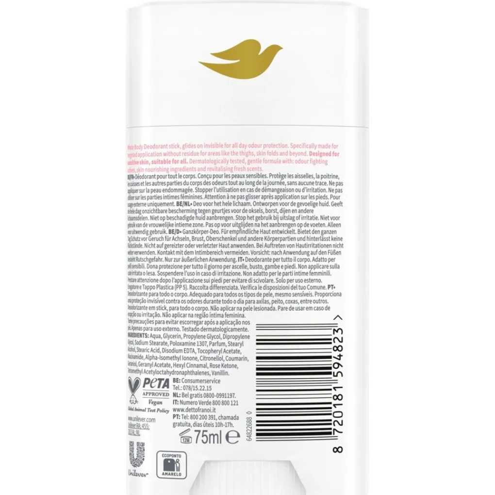 De stick combineert de huidverzorging die je van Dove verwacht met effectieve geurcontrole voor je hele lichaam, zelfs op gevoelige plekken. De deodorant pakt geurtjes bij de bron aan en geeft je een fris gevoel.