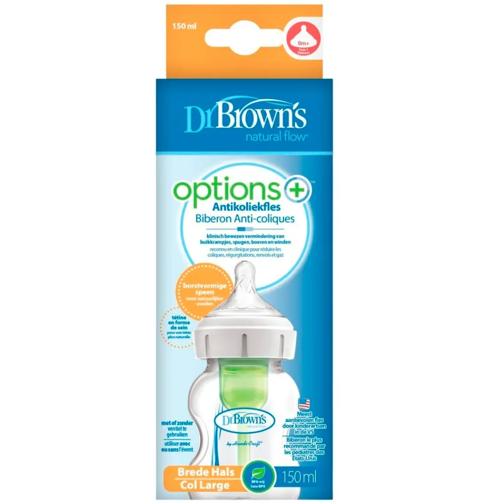 De Dr. Brown’s Options+ 1+M Antikoliekfles met Brede Hals heeft een borstvormige speen. De fles maakt de overgang van borst naar fles en vice versa makkelijker. Zo wordt voeden voor jou en je kindje een plezierige ervaring.