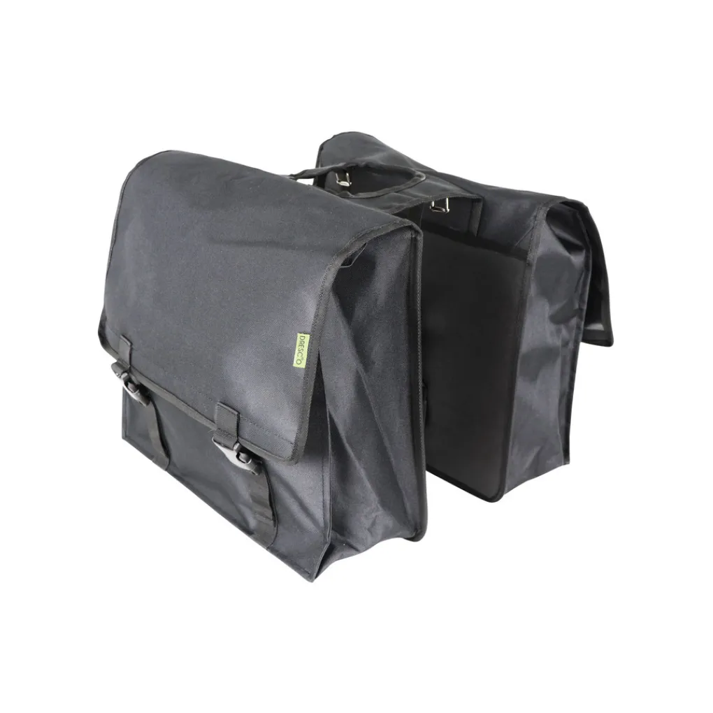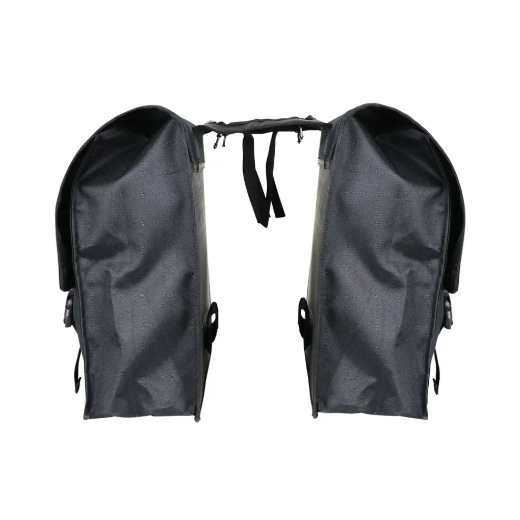 Dubbele zwarte fietstas met reflecterende accenten. Makkelijk te bevestigen op de bagagedrager door de verstelbare banden. De fietstassen zijn gemaakt van waterafstotend nylon met twee verstelbare snel sluitingen. Daarnaast zijn de tassen voorzien van een verstevigde rug en bodem.