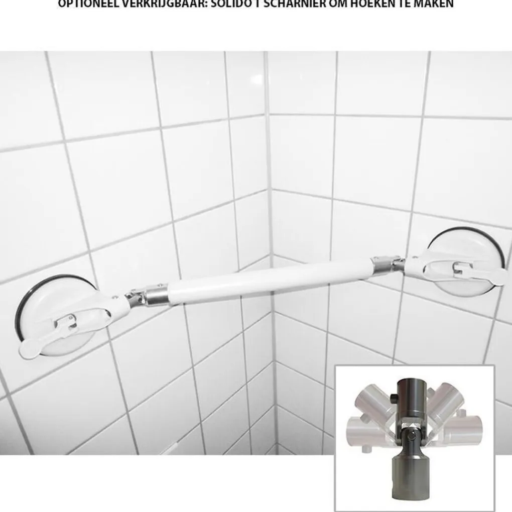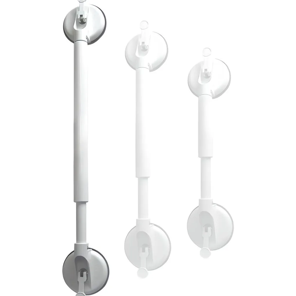 Technische info:de beugels zijn vervaardigd uit hoogwaardige witte kunststof, geen scherpe kanten, alle metalen delen zijn van roestvrij. Staalzuignappen van een speciale rubbersamentelling, de hechting is afhankelijk van de structuur van de tegels Van 44 tot 57 cm totale lengte.