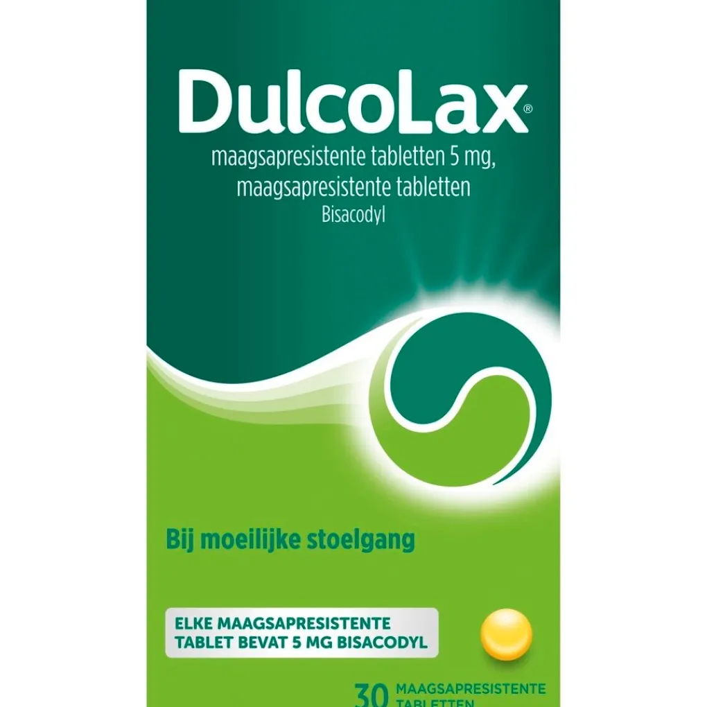 Dulcolax 5mg Tabletten bij moeilijke stoelgang. Dulcolax maagsapresistente tabletten bevatten 5 mg bisacodyl per tablet. De verpakking bevat 30 maagsapresistente tabletten.