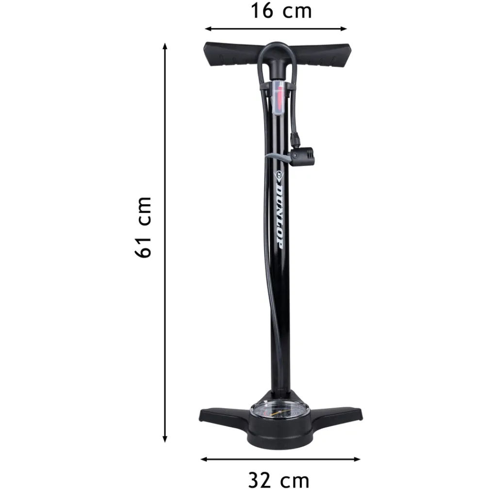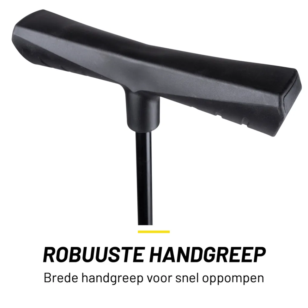 - De fietspomp is een staand model met een robuuste handgreep voor extra grip en een stevige voet aan de onderzijde. Door je beide voeten aan de zijkanten te plaatsen staat deze fiets pomp tijdens gebruik altijd stevig;