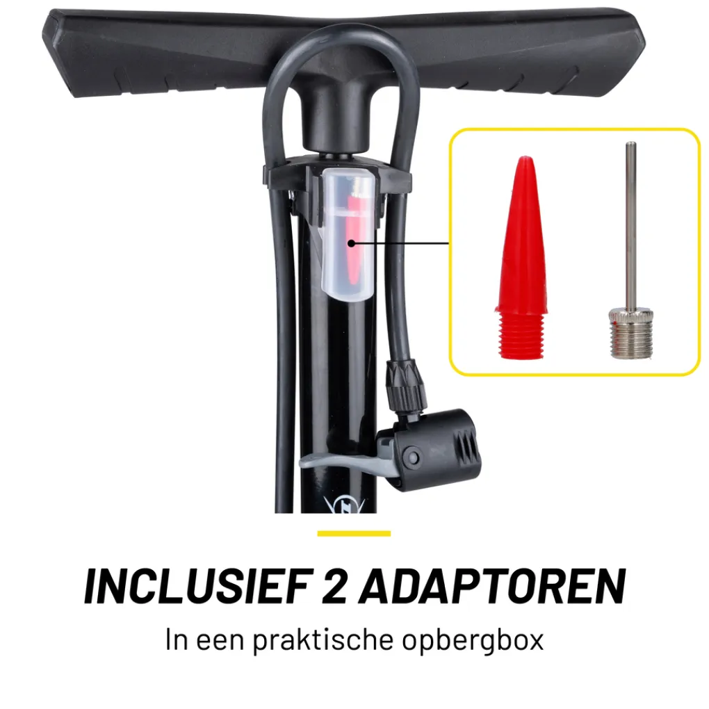 - Naast 2 ventieladaptors is er een doorschijnend opbergbakje op de fietspomp gemonteerd met daarin 2 verloop adaptoren: een voor het opblazen van waterspeelgoed en een naaldventiel voor ballen;
