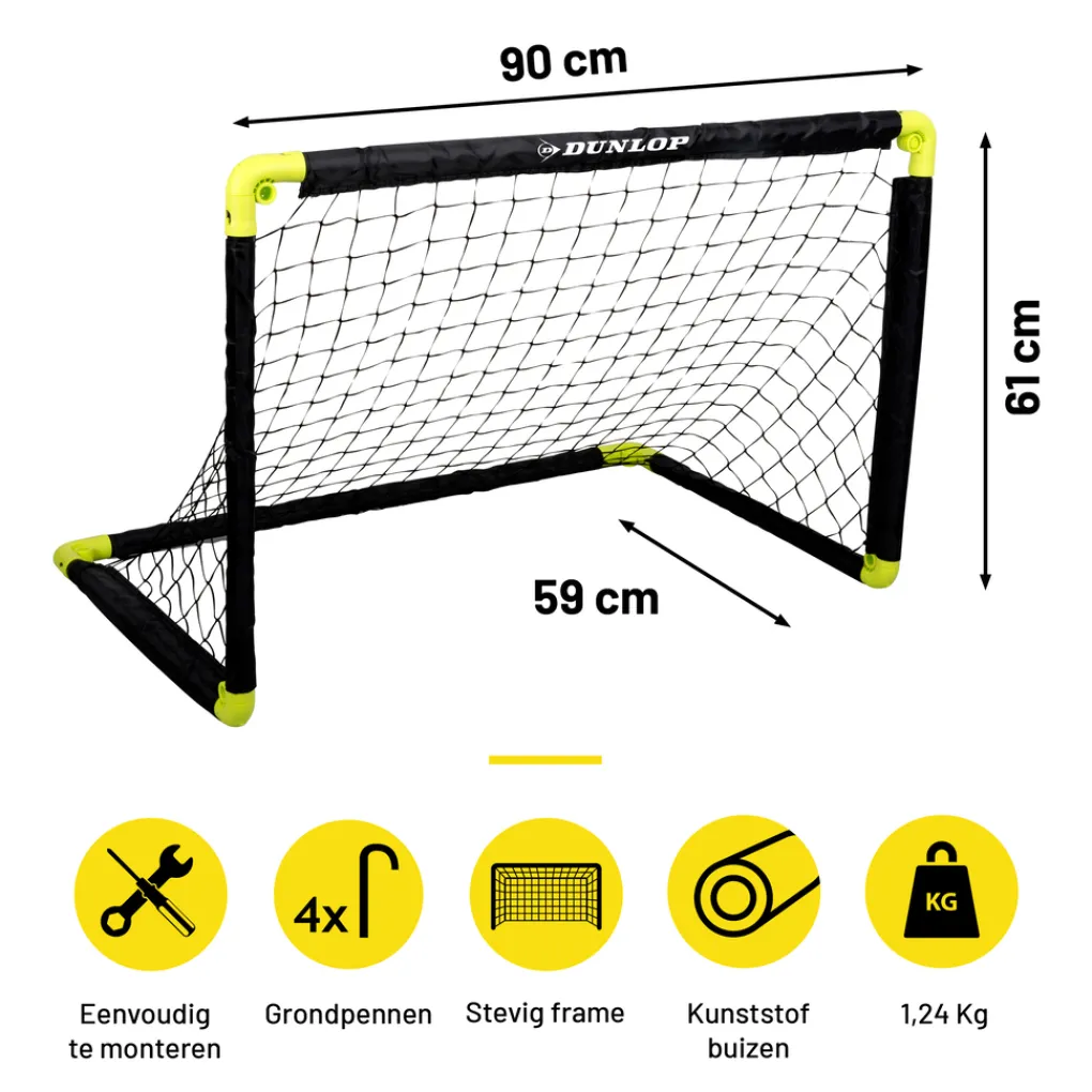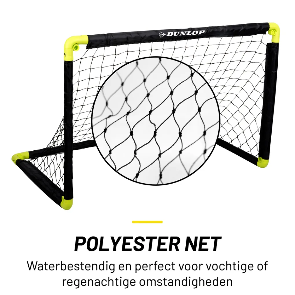 Het Dunlop voetbaldoel heeft een afmeting van 90 x 59 x 61 centimeter. Hierdoor is het doel zeer compact en kun je hem zowel binnen als buiten gebruikten. Voor voetbal training is het goaltje perfect voor alle leeftijden. Oefen op je goaltrap, de hoek waarin je een penalty zou kunnen nemen en andere voetbalskills die op het veld zeker van pas zullen komen. Het voetbaldoel is gemaakt van polypropyleen, een stevige soort kunststof dat zelfs de hardste doelpogingen aan kan.