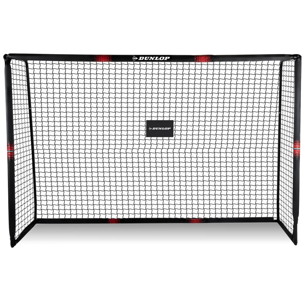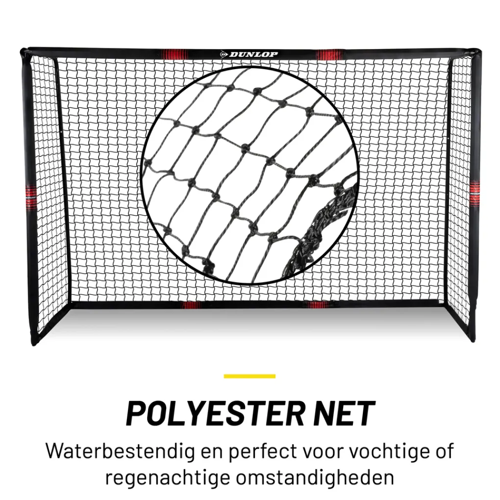De Dunlop voetbalgoal bestaat uit een metalen frame. Hierdoor is het doel uiterst stevig en zelfs weersbestendig. Met de bijgeleverde grondpinnen kun je de goal stevig aan de grond bevestigen zodat deze zelfs bij de hardste doeltrappen overeind blijft staan.