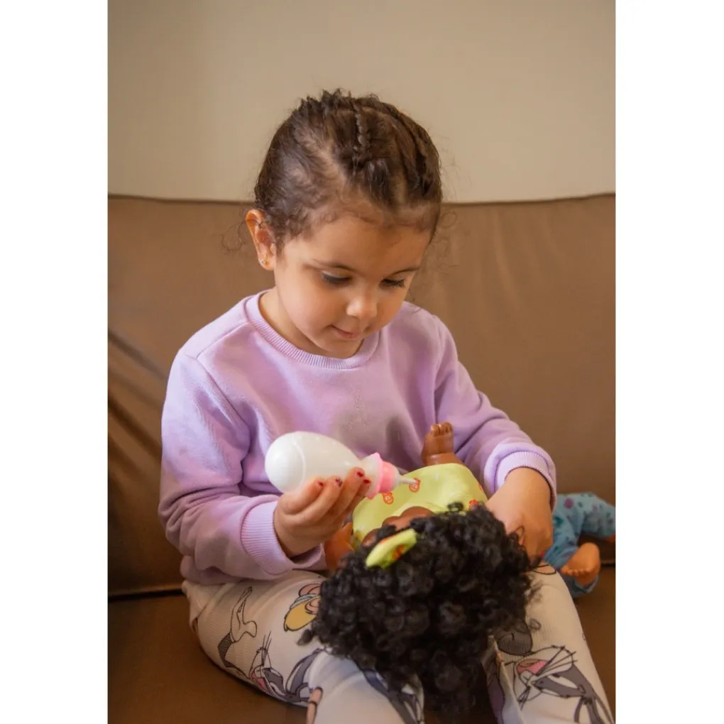 De pop heeft een lief gezichtje en een bruine huidskleur met sprekende ogen. Door haar mooie donkere bos krullen lijkt ze net echt! De pop is 30 cm groot en is geschikt voor kindjes vanaf 3 jaar. In haar mondje zit een gaatje om het zo extra makkelijk te maken om de pop de fles te geven. Let op: het flesje dat je ziet op de foto’s zit er niet bij.