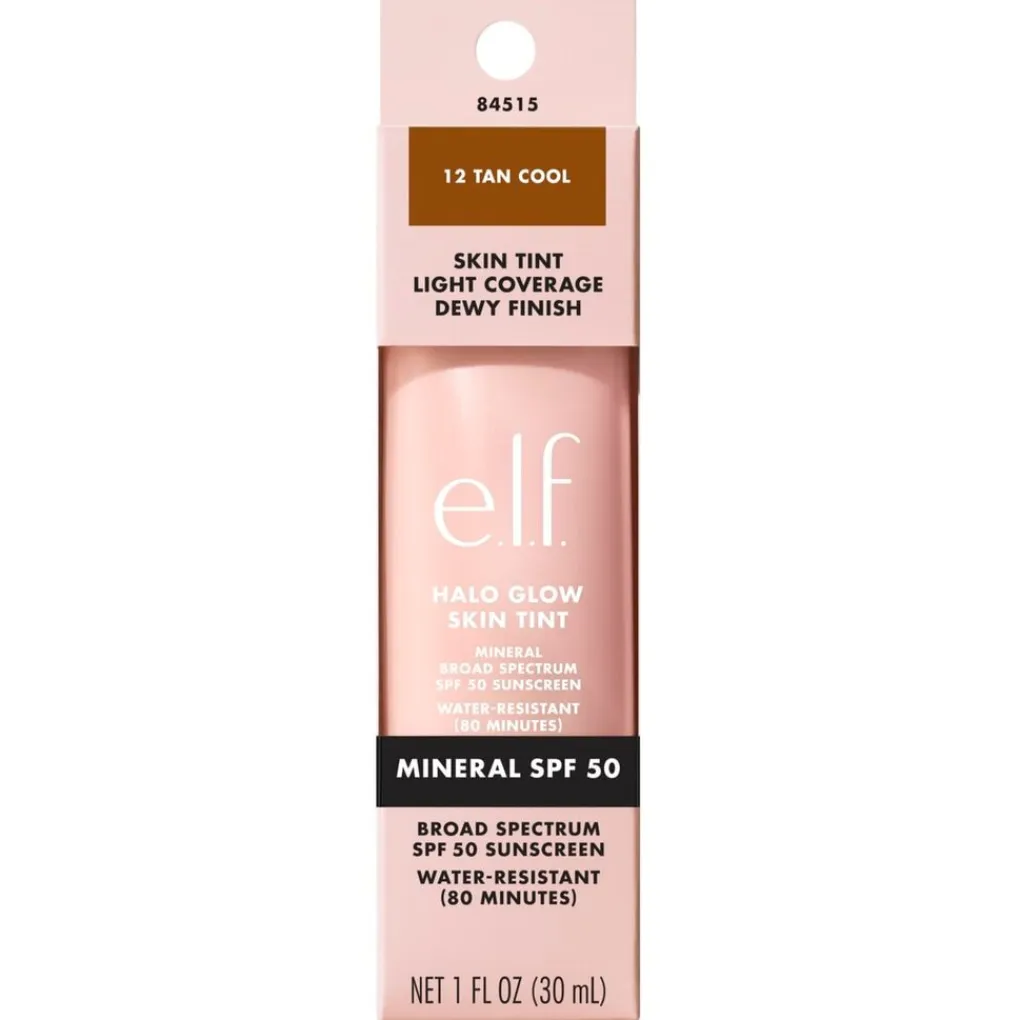De serumachtige e.l.f. Halo Glow SPF50 12 Tan Cool Skin Tint biedt een lichte, opbouwbare dekking met SPF 50 zonder een witte waas achter te laten.