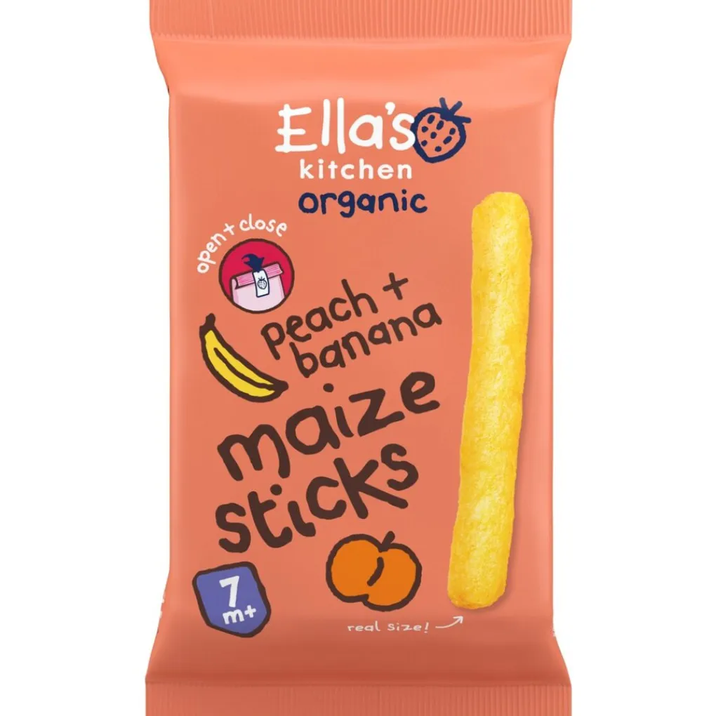 Ella’s Kitchen 7+M Peach + Banana Maize Sticks zijn gepofte maïsknabbels met perzik en banaan. Deze snacks zijn precies groot genoeg zodat kindjes ze zelf op kunnen pakken. Ze smelten in de mond.