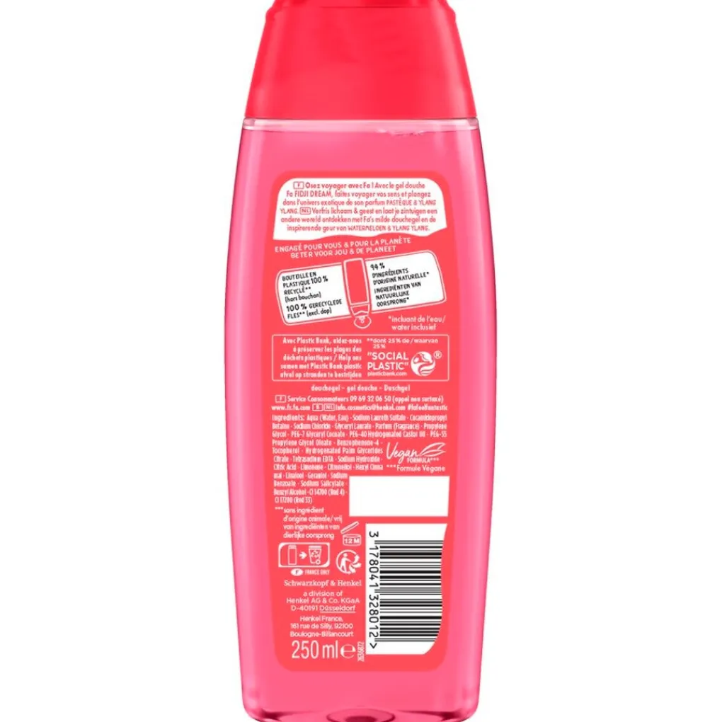 Ontdek Fa Watermelon Waves Douchegel met de geur van watermeloen en ylang ylang. De vegan formule bevat 95% ingrediënten van natuurlijke oorsprong (inclusief water).