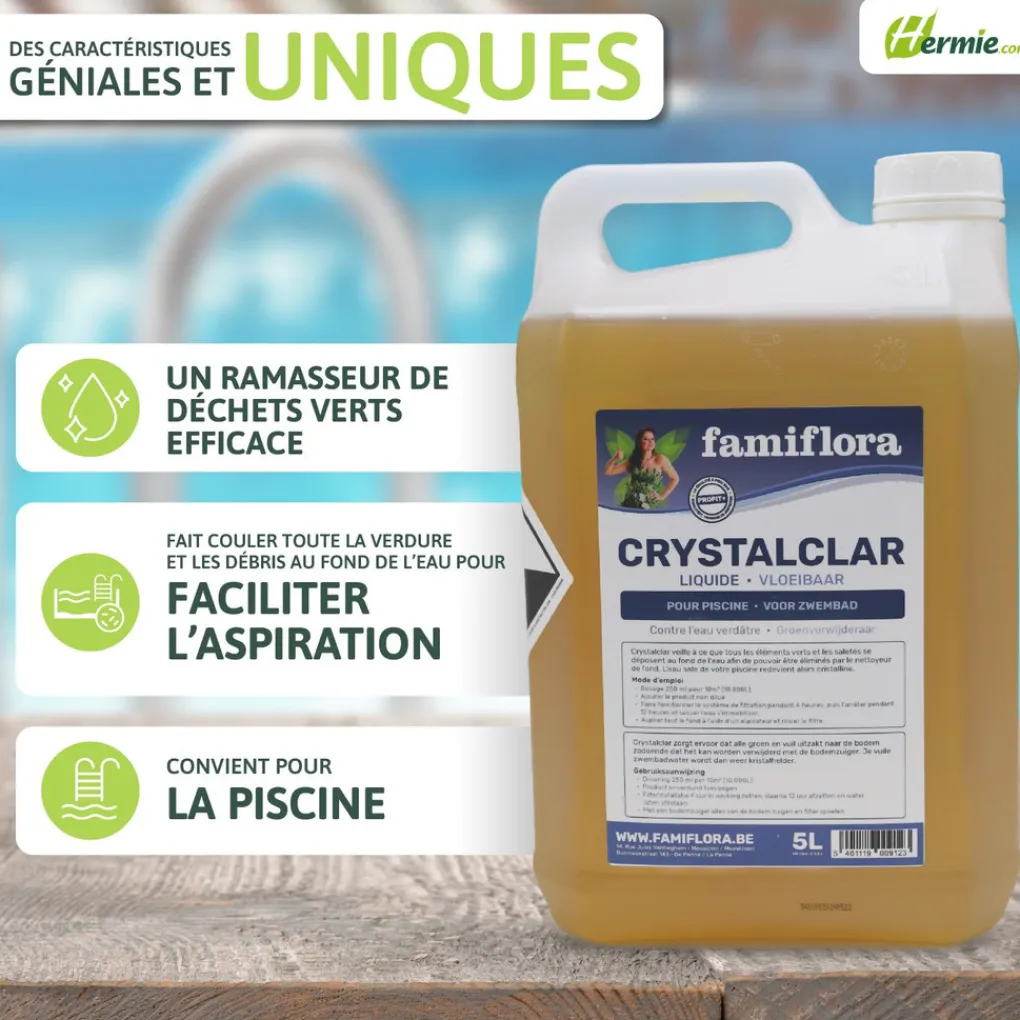 Crystalclar zorgt ervoor dat alle groen & vuil uitzakt naar de bodem zodat het makkelijk opgezogen kan worden door de bodemzuiger. Zo wordt het vuile zwembadwater opnieuw kristalhelder!Dosis: