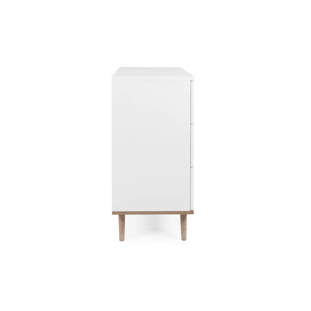 De luxe commode Göteborg van Finori heeft een moderne en Scandinavische look. De Göteborg-collectie is een mix van naturel oak en strak wit. De commode is voorzien van 3 ruime lades en staat op schuine, ranke pootjes. De commode biedt voldoende opbergruimte en is leuk in te richten met bijvoorbeeld mandjes. Zo heb je altijd alles snel bij de hand tijdens het verschonen.