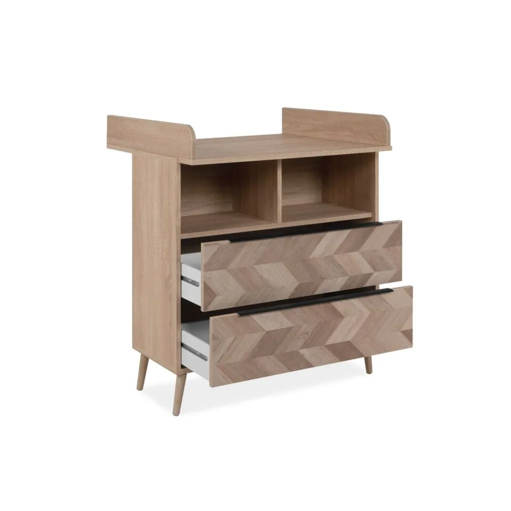 De luxe commode Malmo van Finori heeft een warme en natuurlijke look. De commode staat op rank en licht schuine pootjes, wat de commode een luchtige uitstraling geeft. De Malmo-collectie van Finori heeft een luxe visgraat-motief. De commode is voorzien van 2 grote lade en 2 open opbergvakken. Hierdoor biedt de commode voldoende opbergruimte en is hij leuk in te richten met bijvoorbeeld mandjes. De opzet zorgt ervoor dat je jouw kindje gemakkelijk en veilig kan verschonen op de commode. Dankzij de opstaande randen kan het waskussen niet verschuiven en heb je de mogelijkheid om alle verzorgingsspullen te plaatsen naast de waskussen. Zo heb je altijd alles snel bij de hand zonder dat het op de grond kan vallen.