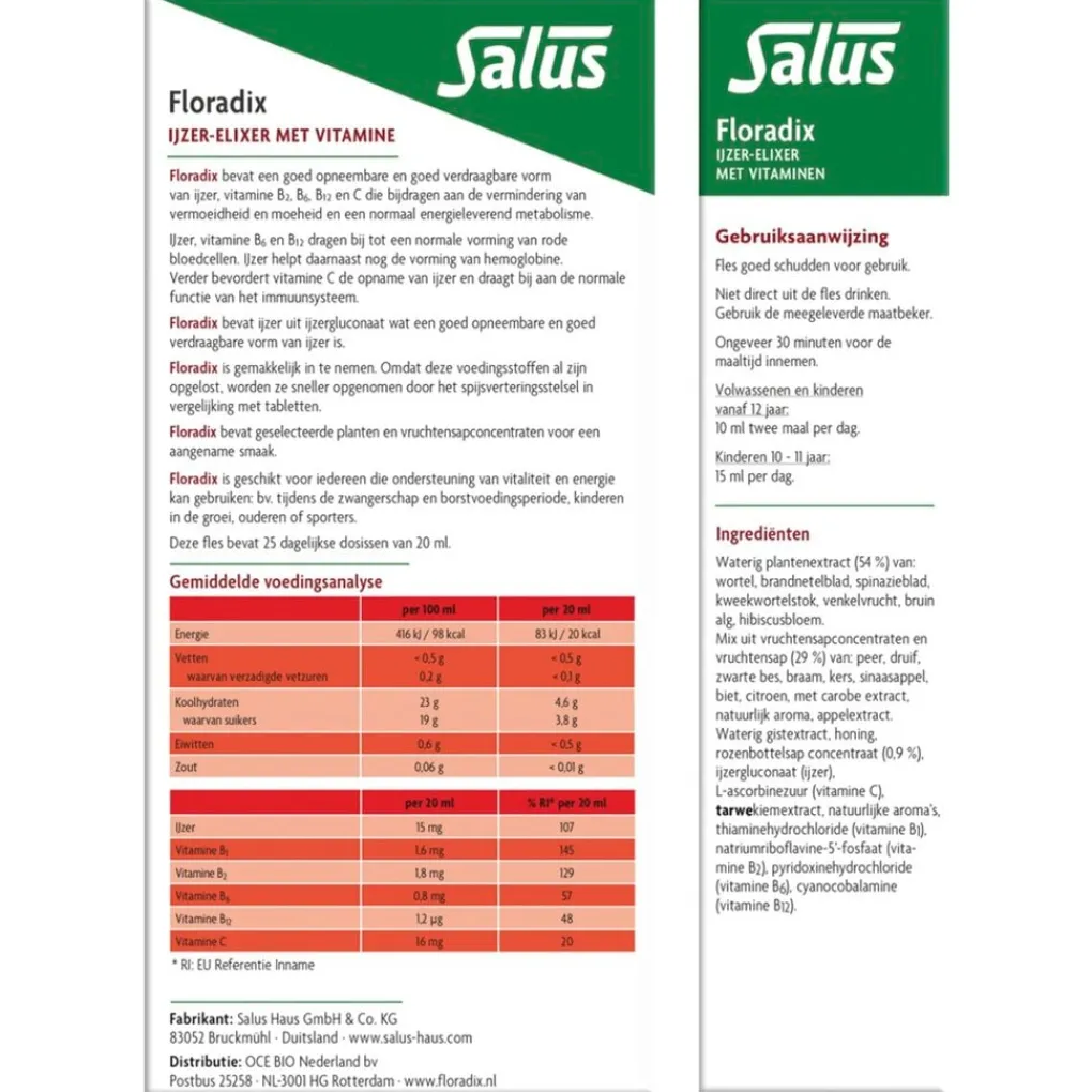 Floradix IJzer-Elixer, aangevuld met groente-extracten en vruchtenconcentraten, draagt bij aan de vermindering van vermoeidheid. Het bevat goed opneembare en verteerbare ijzer en biedt belangrijke voedingsstoffen zoals B-vitaminen.