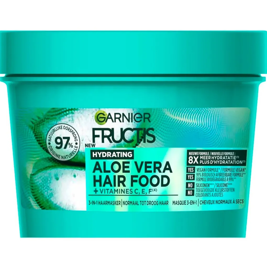 Het Garnier Fructis Hairfood Aloë Vera Haarmasker is vegan haarverzorging op basis van fruit vol voedingsstoffen. 97% van de ingrediënten is van natuurlijke oorsprong. Het masker is geschikt voor normaal tot droog haar.