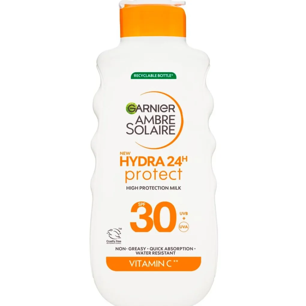 Bescherm en verzorg je huid tegelijkertijd met de Garnier Ambre Solaire Hydra 24H Protect SPF30 Zonnemelk. De zonnebrandcrème met vitamine Cg biedt hoge bescherming tegen uv A- en uv B-stralen.