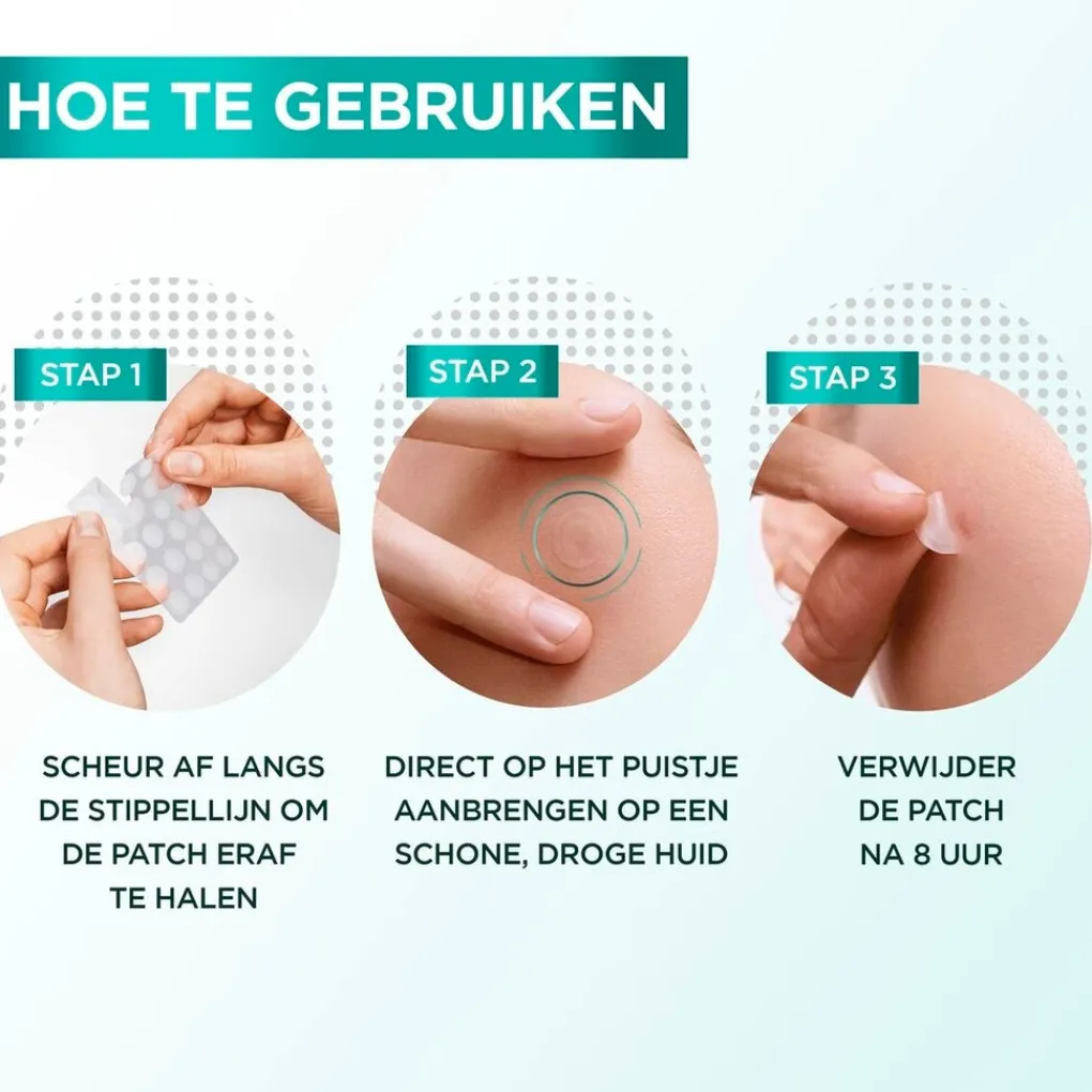 1. Scheur het plaatje langs de stippellijn om de patch los te maken. 2. Breng de patch direct aan op het puistje, op een schone droge huid. 3. Verwijder na 8 uur. Tip: Werkt het beste op puistjes met een witte/gele kop. Verkrijgbaar in twee maten (10mm, 12mm) zodat het geschikt is voor alle puistjes.