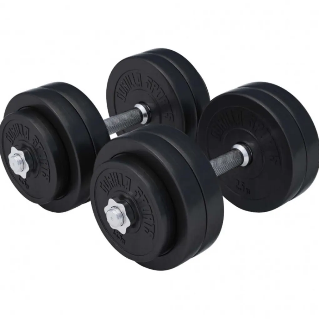 - Inhoud: 4 x 1,25 kg en 8 x 2,5 kg halterschijven, 2 dumbbellstangen 42 cm en 4 schroefsluitingen