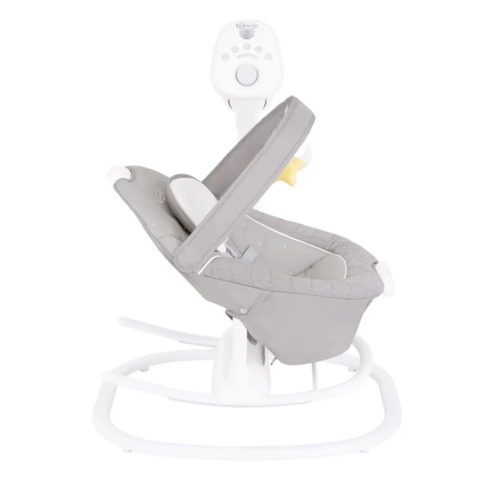 Het schommelmechanisme zorgt voor een rustgevende schommelende beweging die kleintje helpt ontspannen en in slaap vallen. De swing schommelt geruisloos, van voor naar achter of van links naar rechts. Met de elektrische functie kun je de schommelsnelheid aanpassen, je kunt kiezen uit 6 verschillende standen. Daarnaast is de swing ook uitgerust met een trilfunctie op 2 niveaus om buikkrampjes te verlichten. Tevens verstel je ook nog zonder enige moeite de rugleuning in 3 posities voor maximaal comfort. De 5-puntsgordel en het zachte inlegje zorgen voor een fijne ondersteuning en veiligheid. Met 10 muziekopties en de 5 rustgevende natuurgeluiden, zal je baby altijd iets hebben om naar te luisteren terwijl hij of zij ontspant.