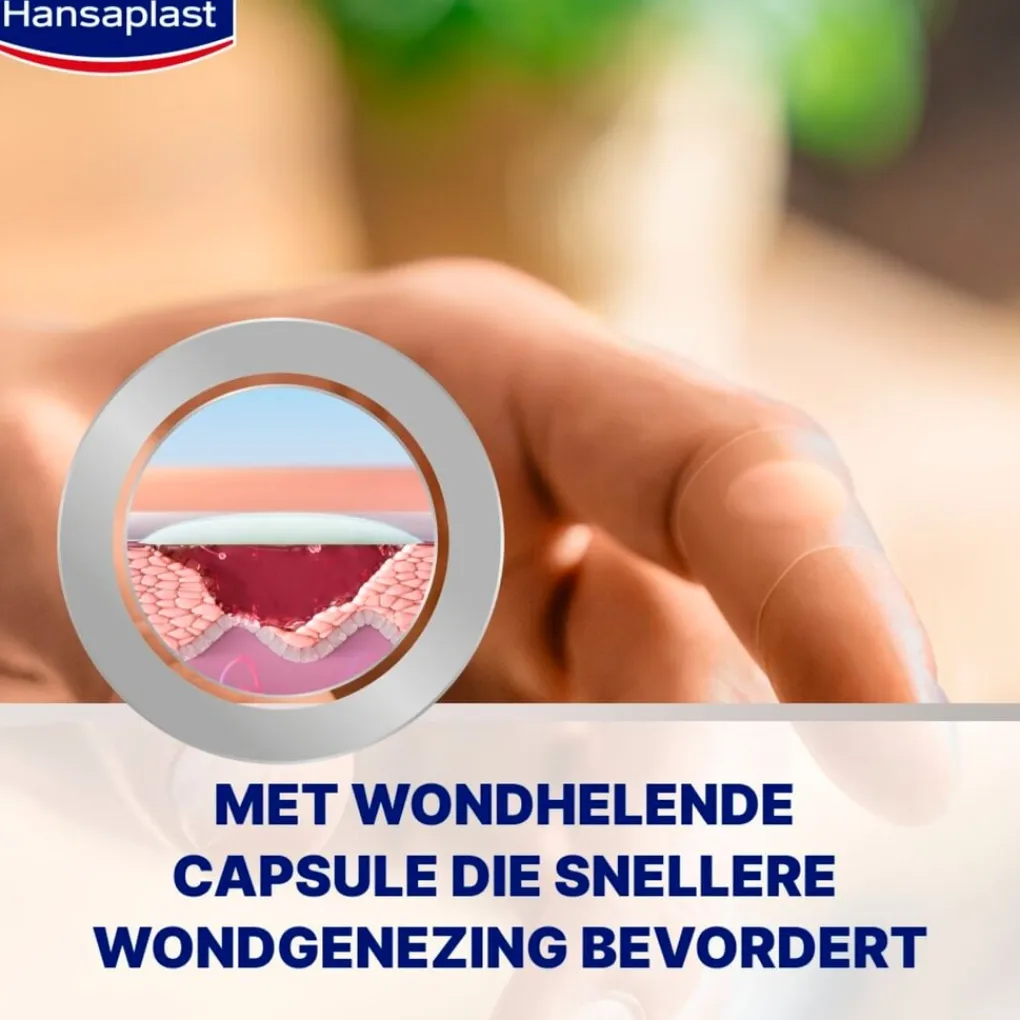 Hansaplast Second Skin Protection Hydrocolloid Pleisters bevorderen een snellere genezing door de helende capsuletechnologie, waarbij de wondverzorging een vochtige omgeving creëert voor een optimale genezing.