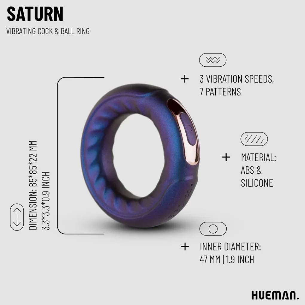 Geniet van een langdurige erectie en intense stimulatie met de Saturn cock- en balring uit de Hueman collectie. De ring beperkt het bloedtoevoer, waardoor de penis en ballen extra gevoelig worden en de erectie harder aanvoelt en langer aanhoudt. Hij is voorzien van 10 verschillende vibratiestanden, waarvan 3 snelheden en 7 patronen. Deze zijn eenvoudig in te stellen met de knop op de ring. De ring is niet flexibel, maar heeft een zachte siliconen coating voor comfortabel gebruik. De ring is volledig waterproof zodat je hem overal kunt gebruiken, zelfs in bad of onder de douche. Ook is hij eenvoudig en snel op de laden met de bijgeleverde USB-kabel. Maak de ring na gebruik schoon met toycleaner en lauwwarm water.