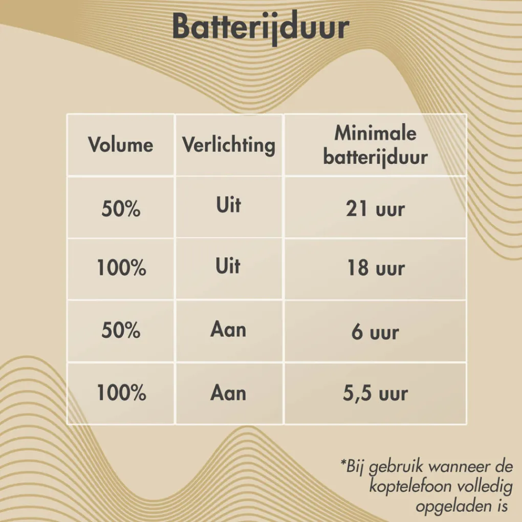 - 13 uur afspeeltijd en binnen 2 uur volledig opgeladen