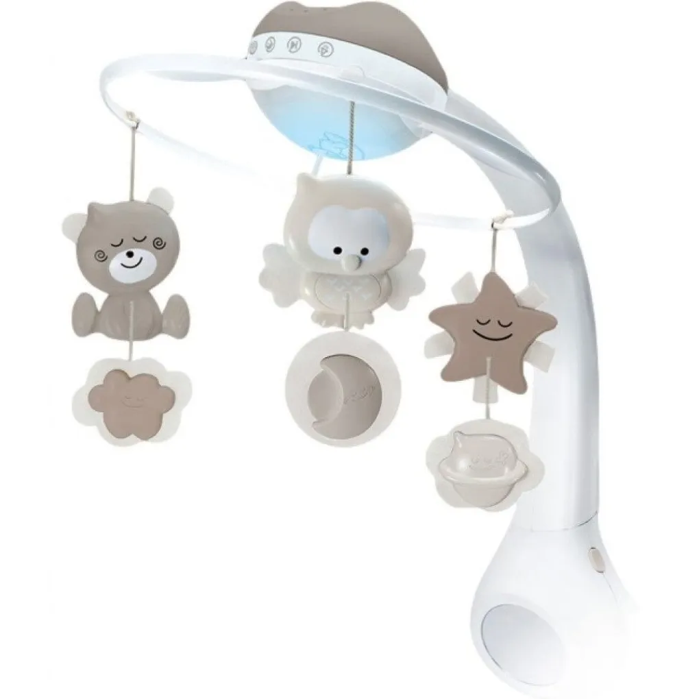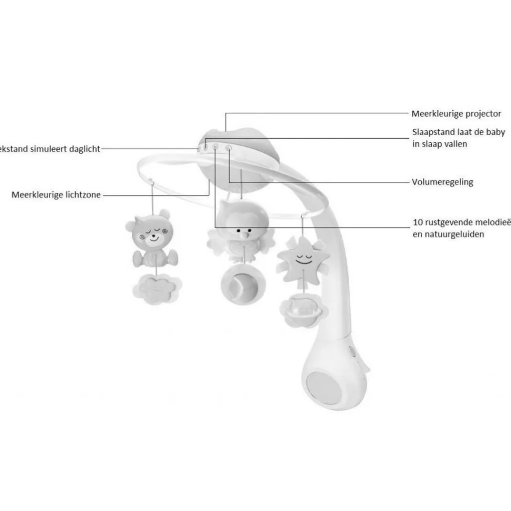 De Muziekmobiel heeft een wekstand en een slaapstand. De wekstand simuleert daglicht voor het vredig wakker worden. De slaapstand laat de baby rustig in slaap vallen. Naast de meerkleurige projector heeft de muziekmobiel ook een meerkleurige lamp die zacht licht geeft. Het volume van de melodieën en natuurgeluiden kan handmatig ingesteld worden. Je bevestigt hem door middel van de draaiknop, deze is uit te draaien tot max. 5 cm.