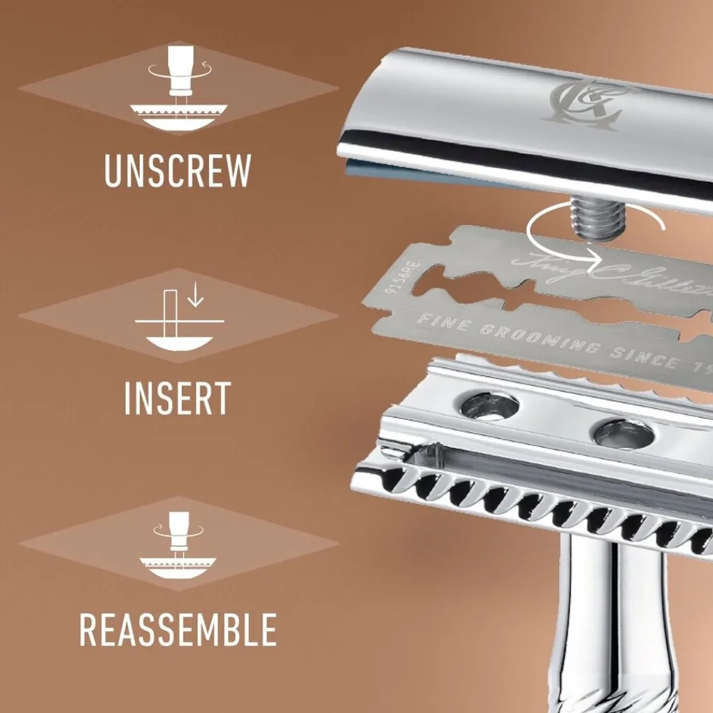Het King C. Gillette Double Edge Safety Razor Scheerapparaat heeft een iconisch ontwerp dat is geïnspireerd op het erfgoed van Gillette, voor een uiterst nauwkeurige afwerking.