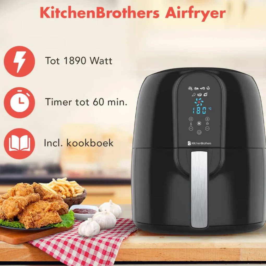 Ruime inhoud De KitchenBrothers Airfryer is perfect om snacks te maken op feestjes of als je gezellig met vrienden bent. De frituurbak heeft een inhoud van 7,2 L. De frituurmand heeft een inhoud van 5,2 L. Door het handige handvat kunnen de frituurpot en -mand gemakkelijk in en uit de Airfryer.