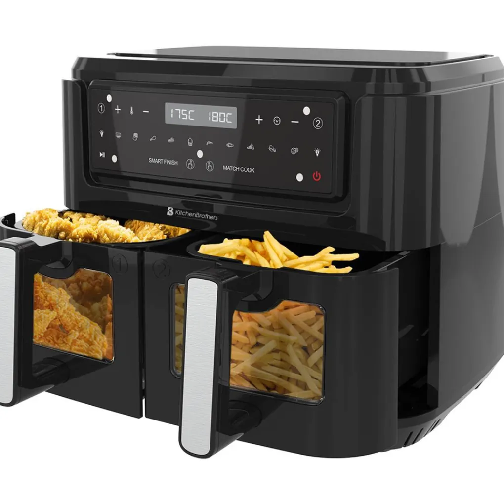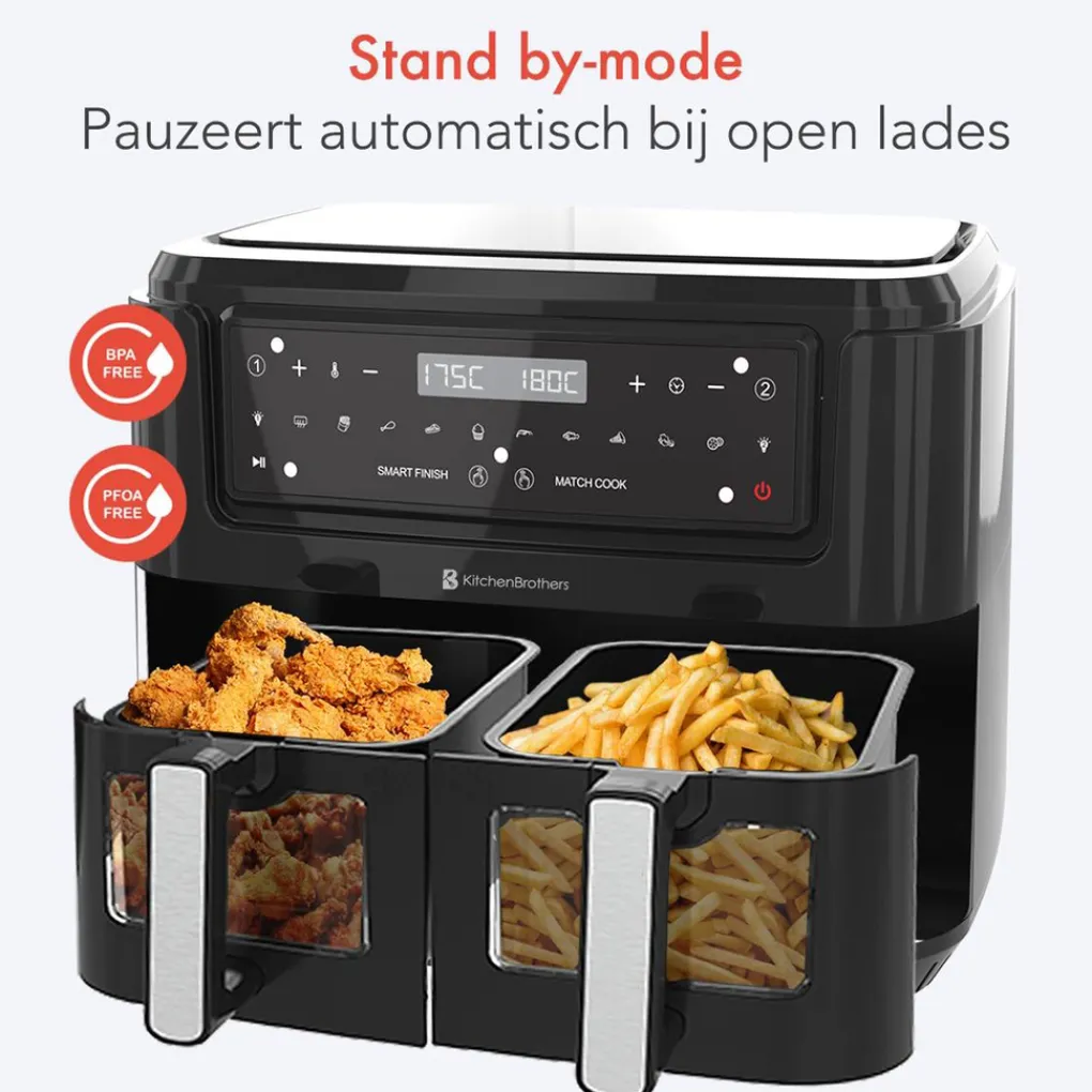 LCD-touchscreen De zwarte airfryer van KitchenBrothers is makkelijk in gebruik door het LCD-touchscreen. De cool-touch buitenkant van deze betaalbare airfryer bevat een oververhittingsbeveiliging zodat je jezelf niet verbrandt. Wanneer je wilt weten hoe het met het eten gaat in de airfryer, kun je dit eenvoudig vanaf de buitenkant zien. Het kookproces is te volgen door het transparante venster aan de voorkant van beide frituurmanden en de verlichting.