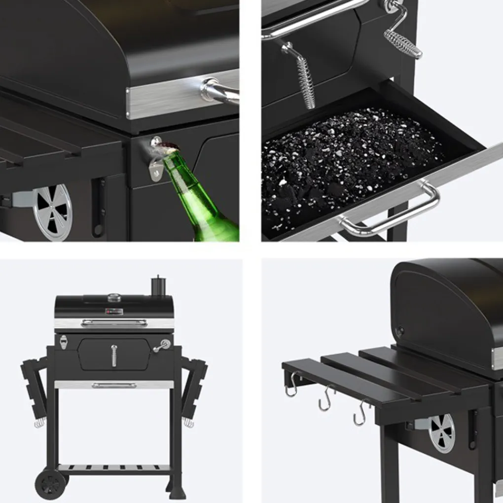 Maak de zomeravonden compleet met de handige extra’s die deze houtskoolbarbecue biedt. Zo kan je het kolenrooster in hoogte verstellen, waarmee je de hitte-intensiteit zelf in de hand hebt. Ook heeft deze barbecue een extra ventilatierooster en een rookpijpje, voor het optimaal instellen van de luchtstromen door de barbecue. Voeg eenvoudig kolen toe of haal ze er snel uit dankzij de kolenlade. Deze kan je eenvoudig opnenen om toegang te krijgen tot de kolen, zonder het grillrooster eraf te moeten halen. Aan de zijpanelen zijn haakjes bevestigd. Ideaal voor handdoeken, tangen en ander keukengerei. Tot slot: altijd een ijskoud biertje snel openmaken met de ingebouwde flessenopener.