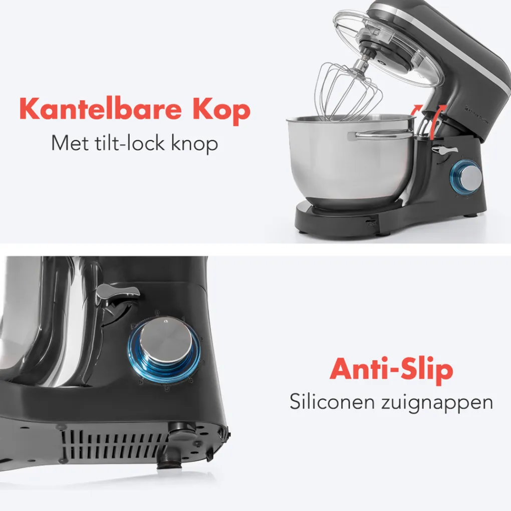 Gemakkelijk in gebruik De KitchenBrothers 2000W keukenmachine heeft een sterke en duurzame ABS-plastic behuizing en is daardoor lichter van gewicht dan een model met aluminium behuizing. Hierdoor is de keukenmachine gemakkelijk te verplaatsen als je deze bijvoorbeeld in en uit een kastje wil halen. De kantelbare kop van de keukenmachine voegt nog meer gemak toe. Zo hoef je niet te worstelen om de mengkom in of uit de machine te krijgen en giet je niet per ongeluk je mengsel over de rand.