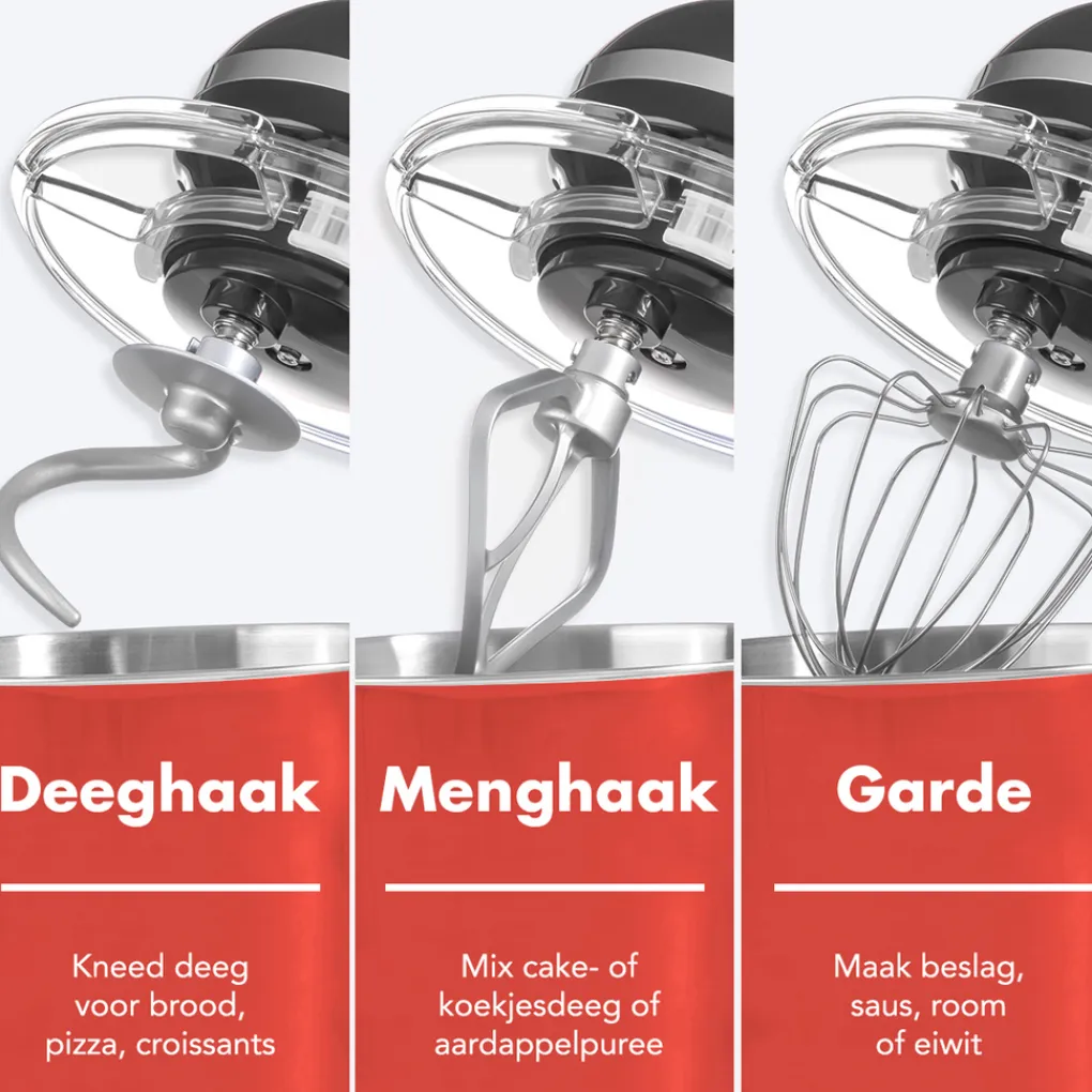 Multifunctioneel Om je overal bij te kunnen assisteren wordt de KitchenBrothers Keukenmachine geleverd met 3 verschillende vaatwasserbestendige opzetstukken: Een menghaak, een garde en een deeghaak.
