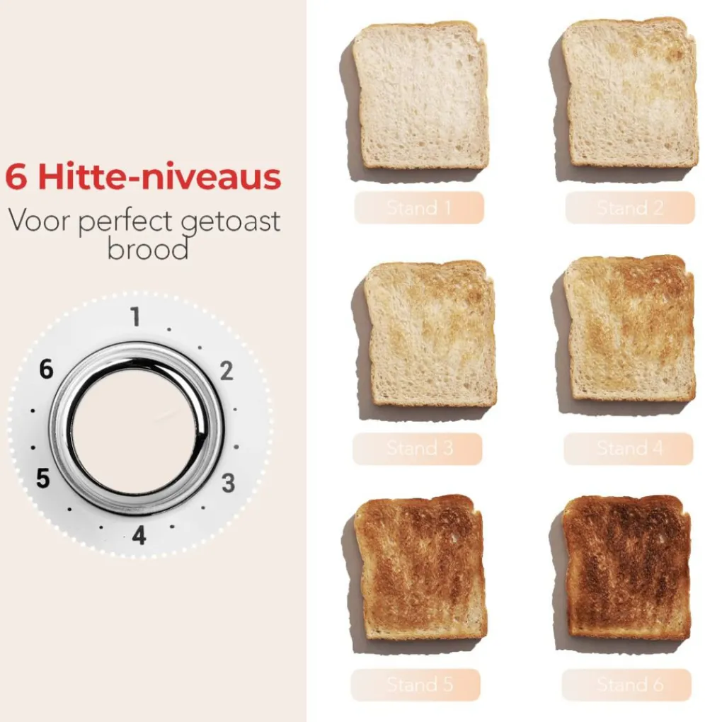 6 Standen Hou jij van hele lichte toast? Of juist hele donkere? Met de broodrooster van KitchenBrothers heb je alle keuze. Kies uit één van de zes verschillende hittestanden:
