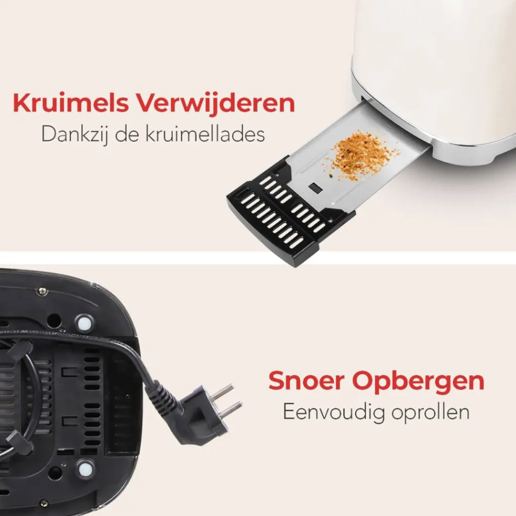 Eenvoudig snoer opbergen Iedereen houdt van een opgeruimde keuken om de dag in te beginnen. De broodrooster van KitchenBrothers is ontworpen om je keuken zo netjes mogelijk achter te laten. Zo kun je het stroomsnoer bijvoorbeeld netjes onder de broodrooster opbergen. Daarnaast vind je hier ook twee handige verwijderbare kruimellades. Opgeruimd staat netjes!
