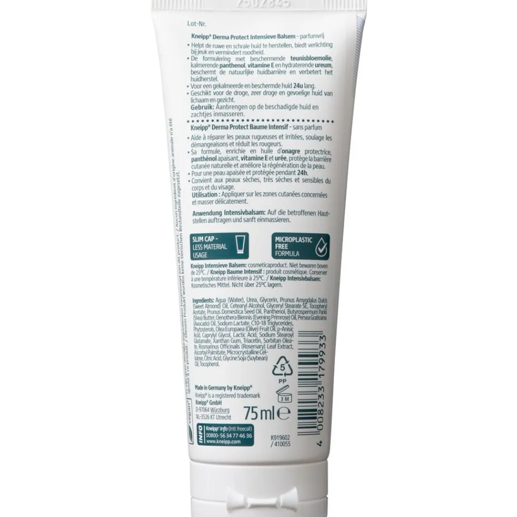 De Kneipp Derma Protect Intensive Balm bevat 10% ureum. Ureum hydrateert intensief, houdt vocht vast en maakt je huid soepel. Teunisbloemolie beschermt en kalmeert je huid met essentiële vetzuren. Panthenol en vitamine E bevorderen huidherstel en bieden extra verzorging.