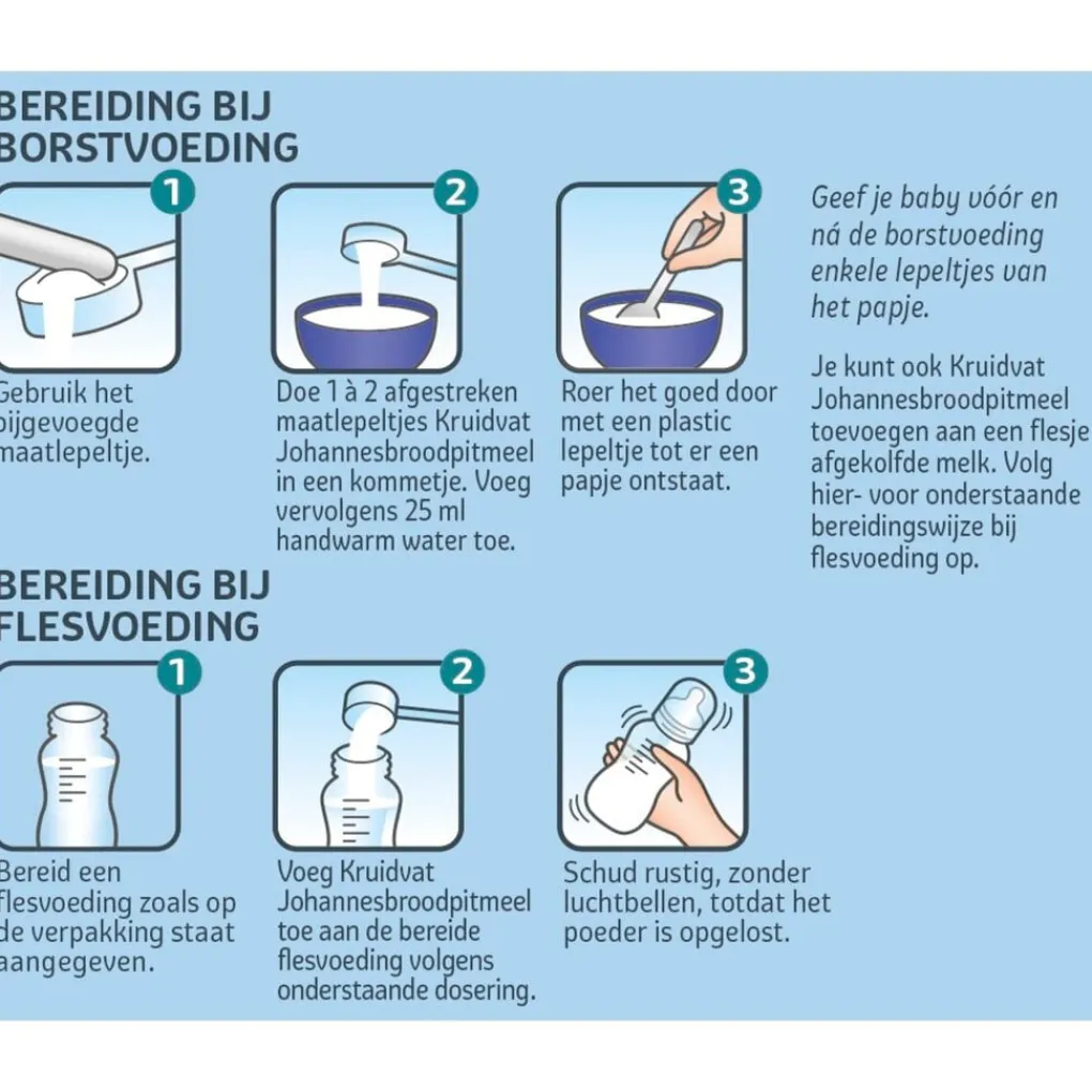 Geeft je kindje regelmatig voeding terug, dan is Kruidvat 0+M Johannesbroodpitmeel een uitkomst.