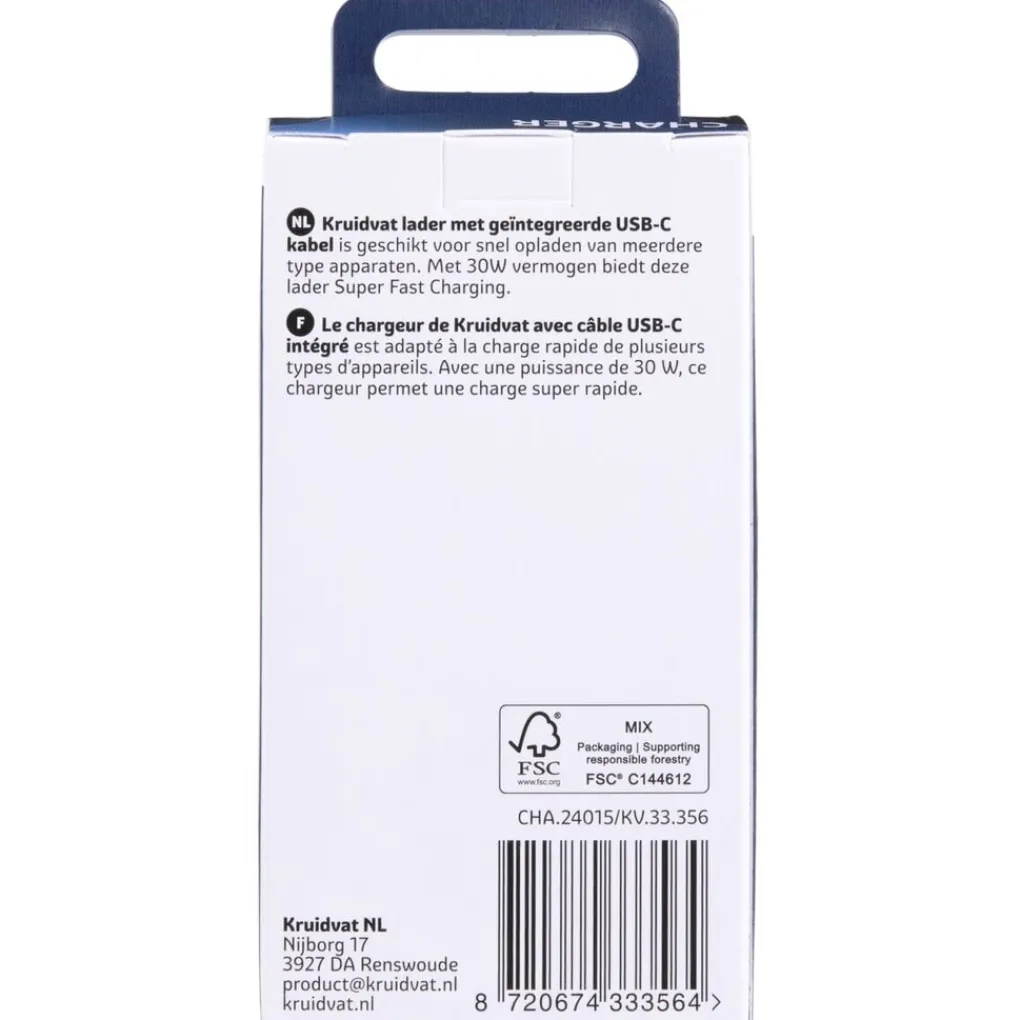 De Kruidvat 30W USB-C Oplader is een alles-in-één oplossing met geïntegreerde kabel en Power Delivery lader waardoor je geen losse adapter nodig hebt.