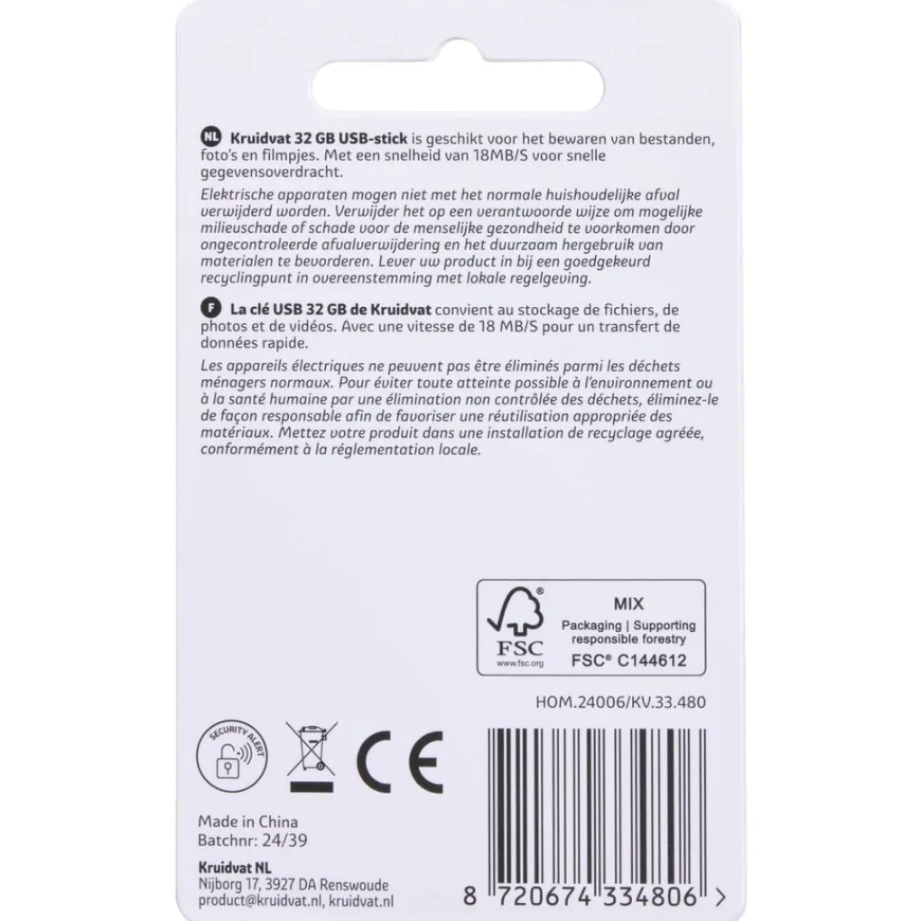 Bewaar bestanden, foto’s en filmpjes op deze Kruidvat 32GB USB-stick. De compacte USB-stick heeft een opslagcapaciteit van 32 gigabyte en een snelheid van 18 MB/S.
