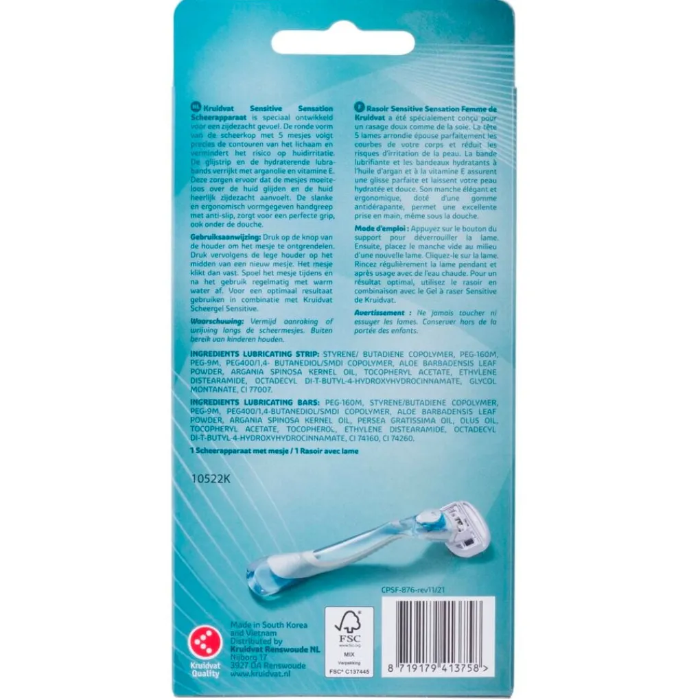 Het Kruidvat 5 Sensitive Sensation Scheerapparaat is speciaal ontwikkeld voor een zijdezacht gevoel en veilig scheerresultaat.