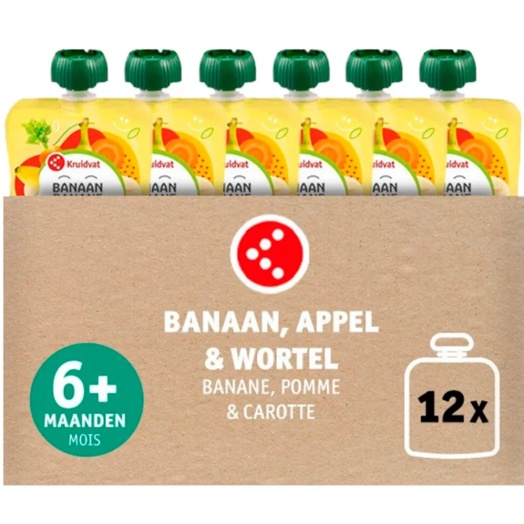 Dit Kruidvat 6+M Bio Banaan met Appel en Wortel Knijpzakje bevat biologische fruitpuree voor zuigelingen vanaf 6 maanden. Het fruitzakje bevat geen toegevoegde suikers, maar alleen suikers die van nature aanwezig zijn in fruit.