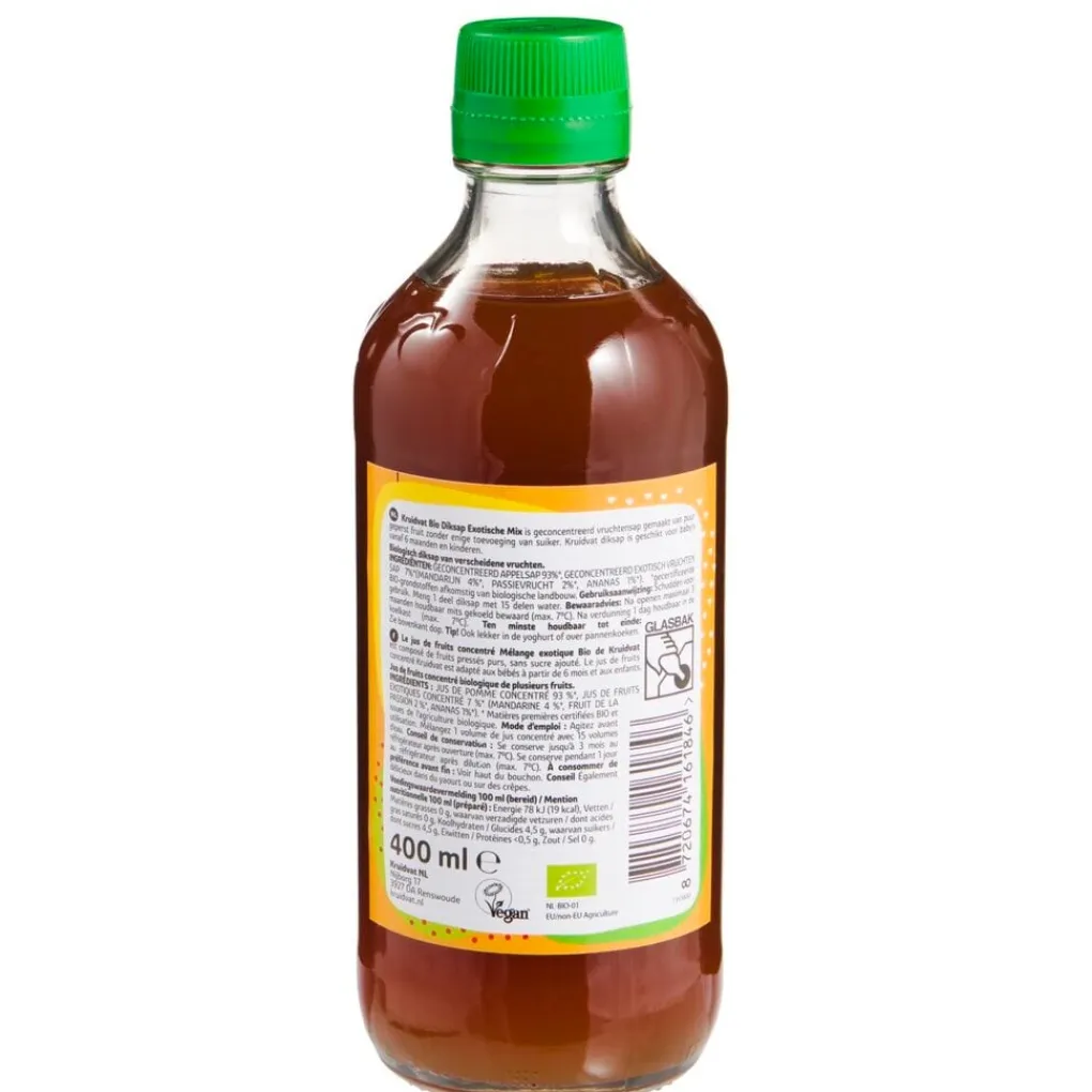 Ingrediënten: Geconcentreerd Appelsap 93%*, Geconcentreerd exotische vruchtensap 7% *(mandarijn 4%*, Passievrucht 2%*, ananas 1%*). *gecertificeerde bio-grondstoffen afkomstig van biologisce landbouw.
